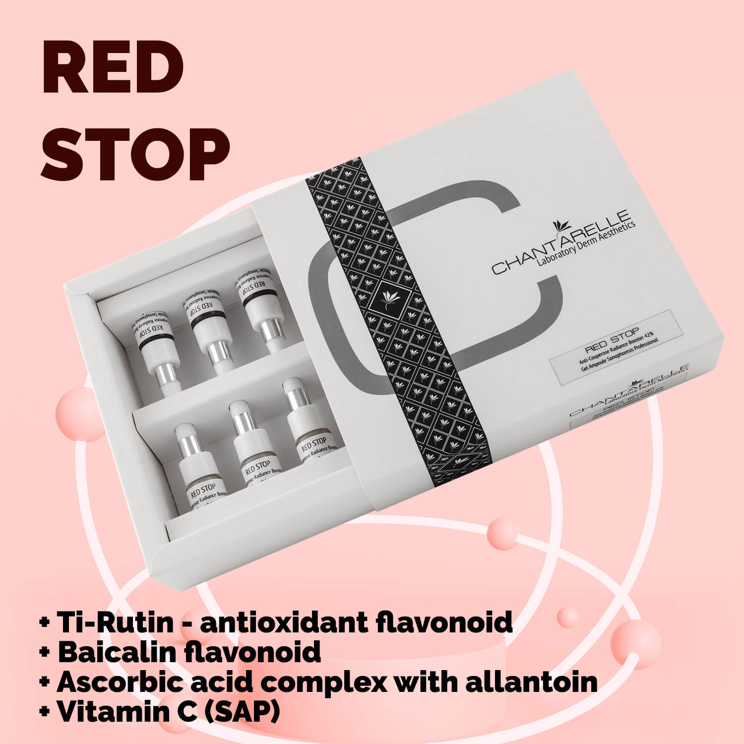 The Red Stop line is a year-round treatment to soothe and strengthen vascular and sensitive skin with symptoms of rosacea.