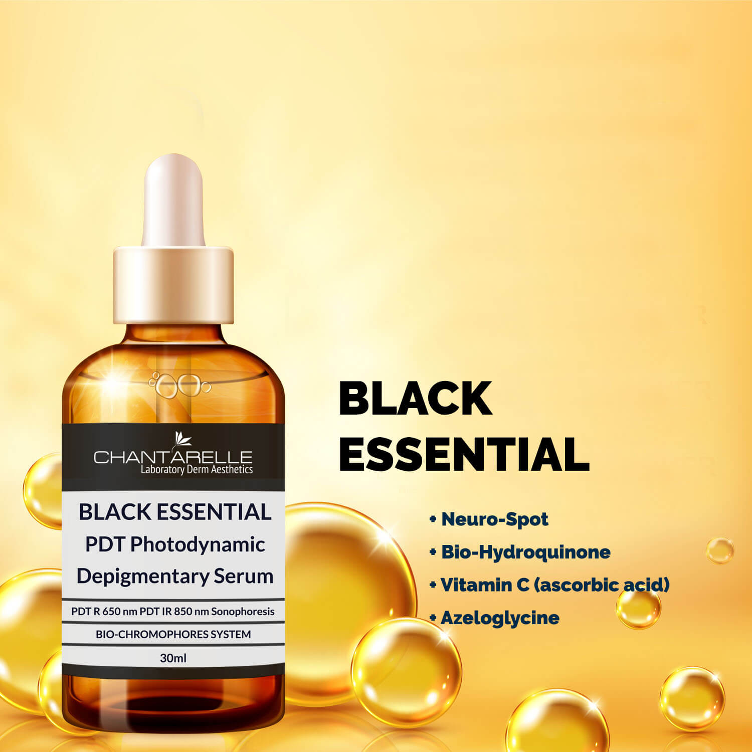Black Essential’s PDT formulations show the highest efficacy when PDT is applied with the LLLT laser with magnetic field. The laser light acts directly on the energy centres of the cells. It stimulates their metabolism and stimulates them to work intensively. The effect of the treatment is significantly prolonged over time. The magnetic field increases the stimulation effect in the tissues. The synergistic use of laser light and photosensitive preparations, such as PDT Black Essential, guarantees an immediate treatment effect. The active ingredients contained in the PDT Black Essential concentrates act immediately after their application and simultaneously optimise the effect of the laser. This leads to enhanced tissue processes, increased collagen production and skin remodelling. Such rapid tissue renewal and restructuring would not be possible if laser and photoactivators were applied separately.